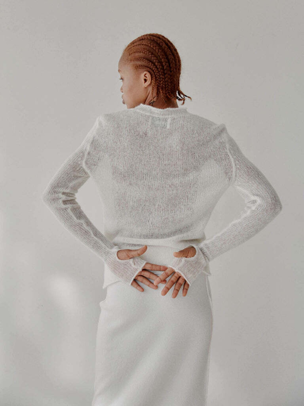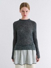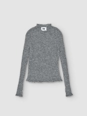 ロール仕上げのリブ襟、細身で長めのスリーブ、親指ホール付きのデザインが特徴です。