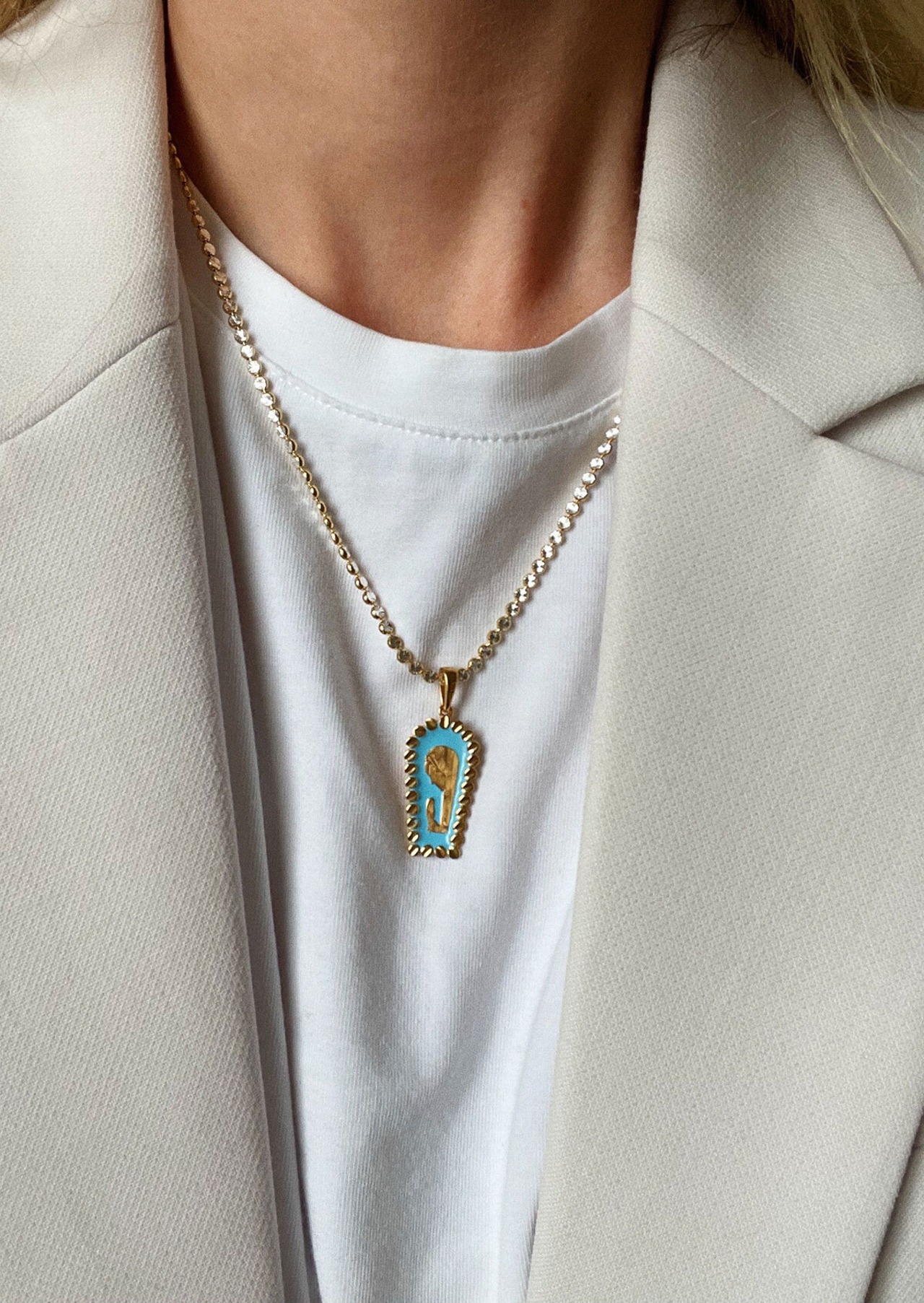 祈りを捧げる女性を描いた、特別なエナメルチャーム。