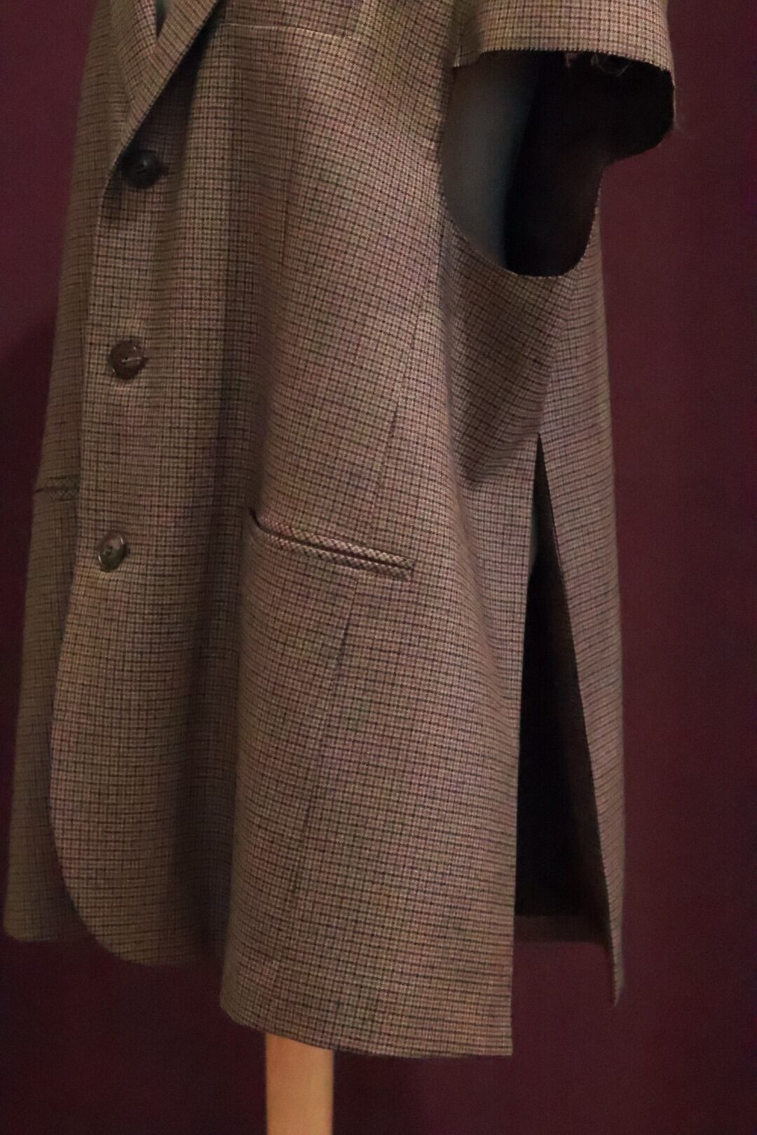 通年着用可能でニットやジャケットの上にも織れる広めのアームホールや大きく開いた後スリットが特徴的です