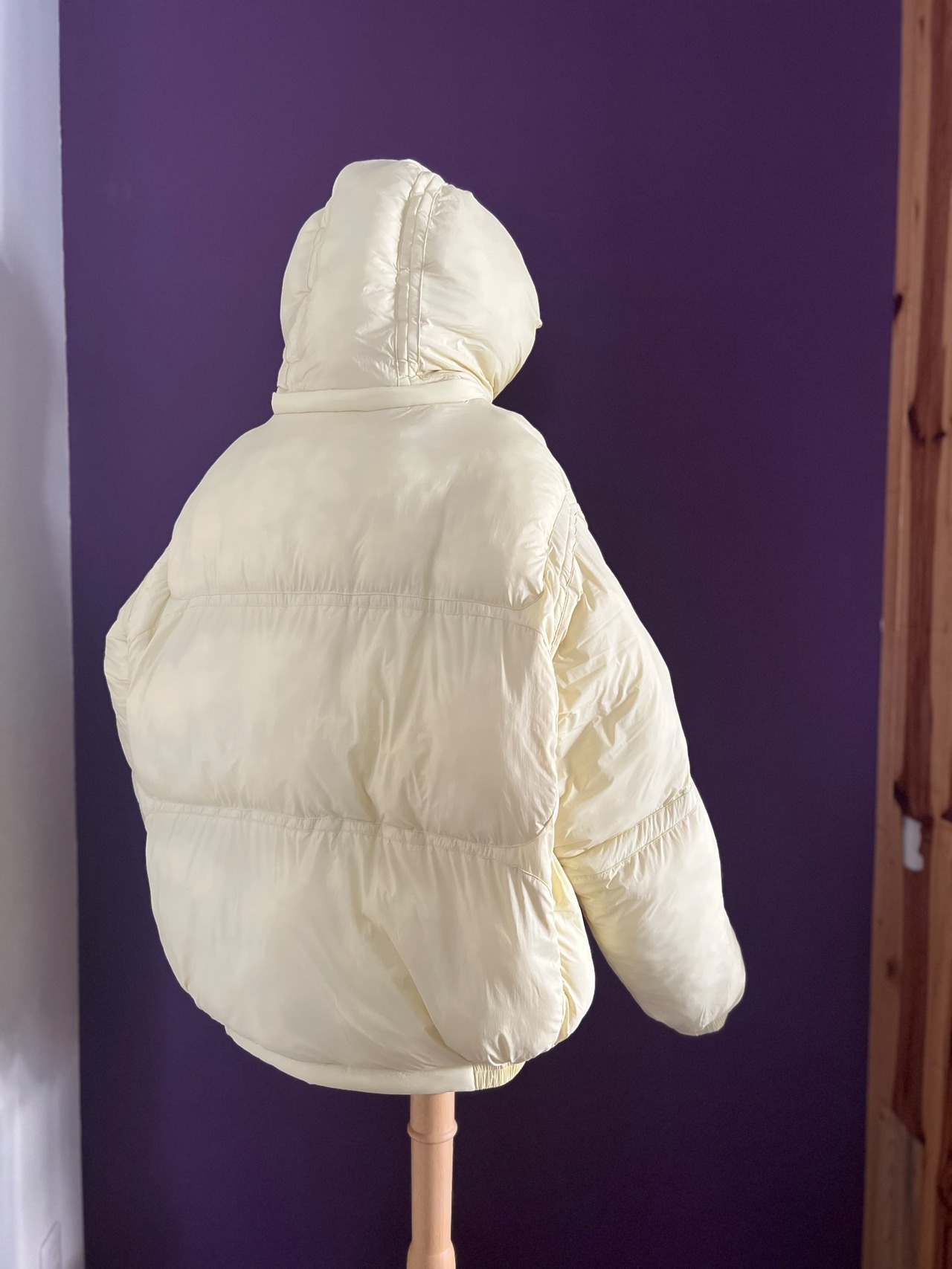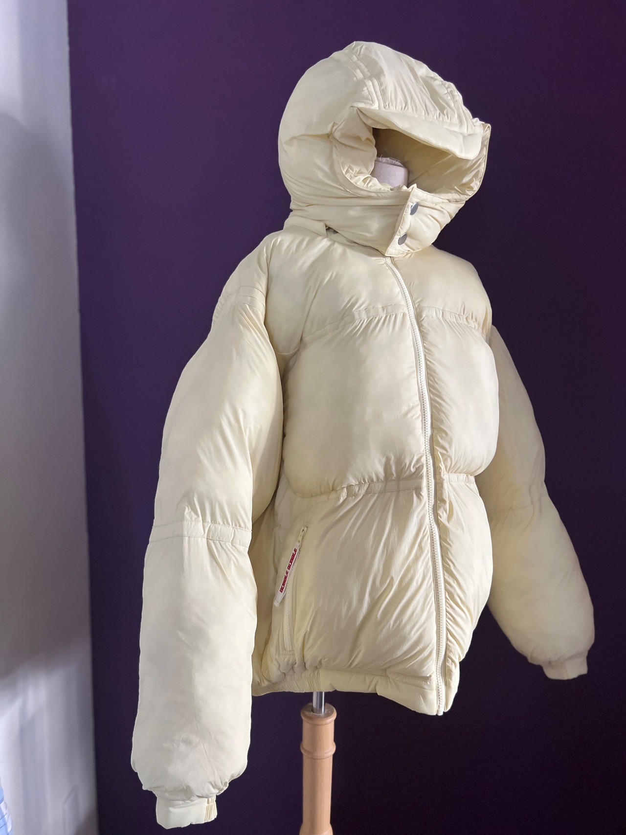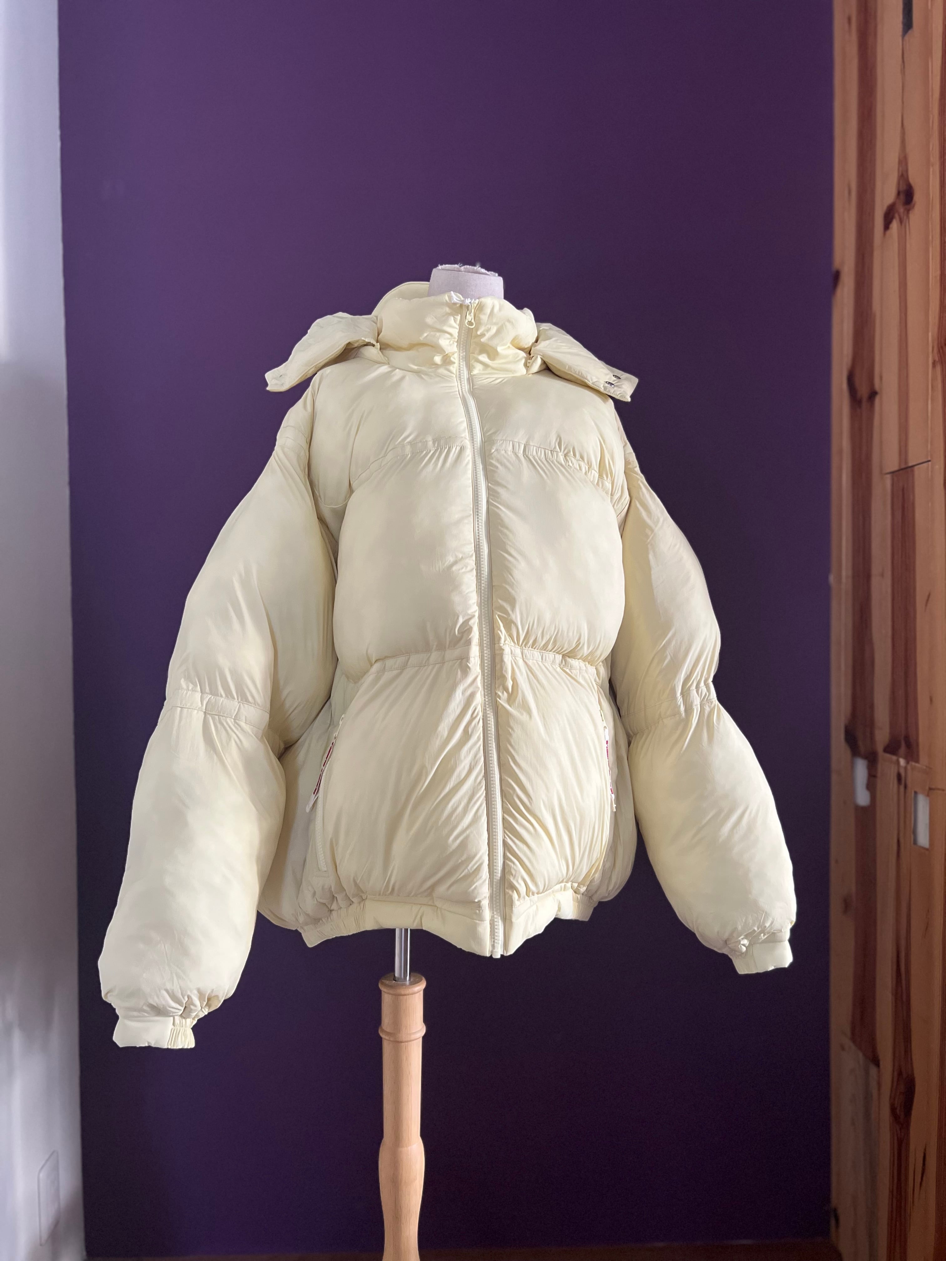 丸みのあるシルエットが愛らしい、中綿のダウンジャケットです。