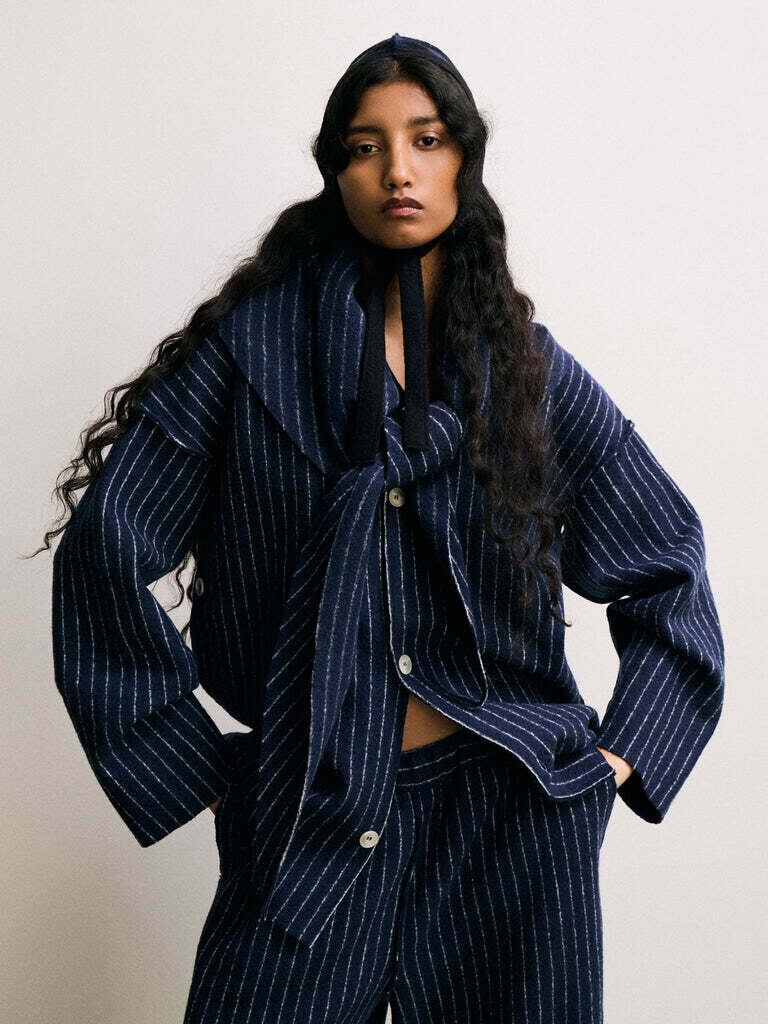 ボイルドメリノウールで作られた、取り外しできる三角ストールつきのカーディガンです。
