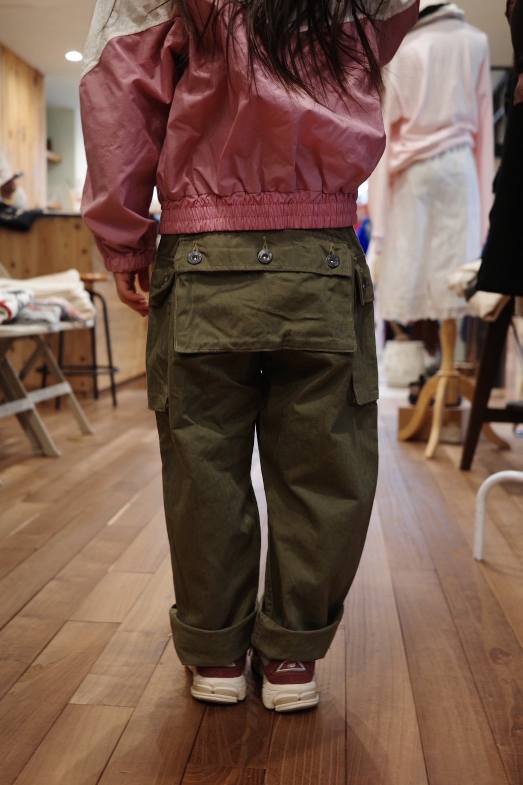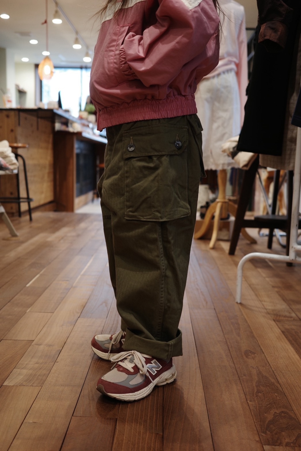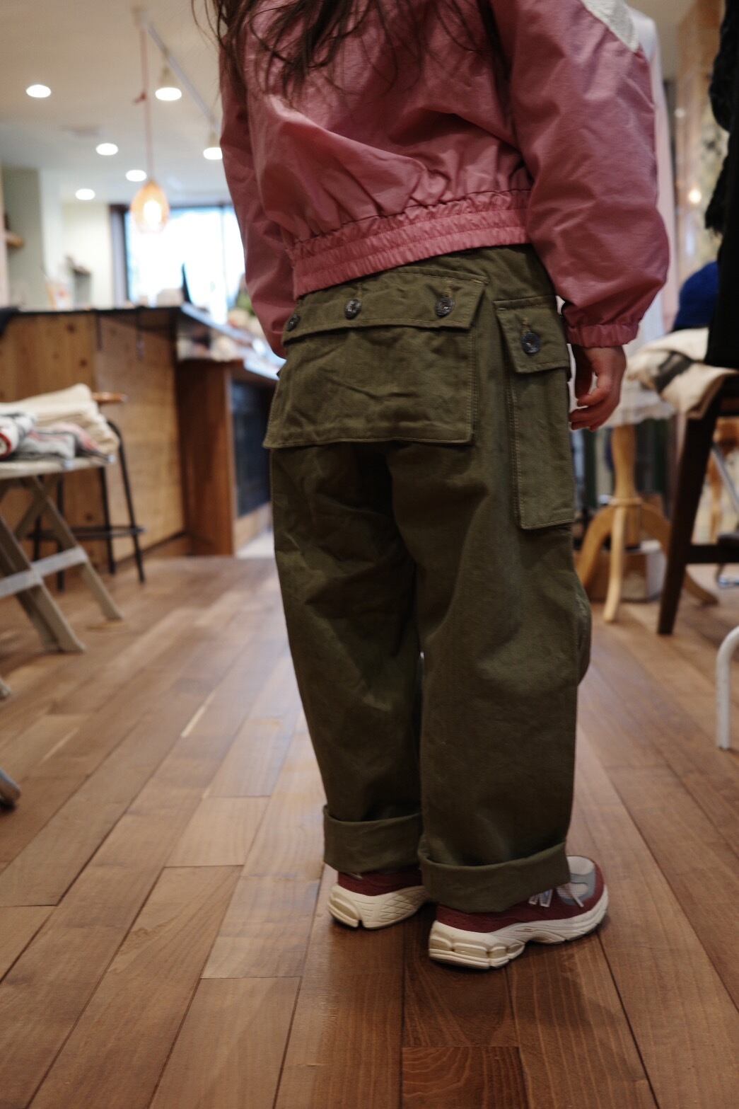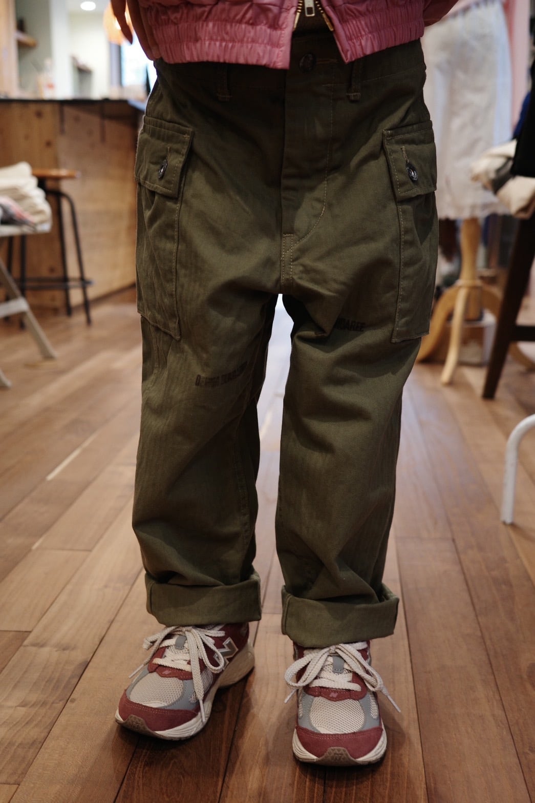 脇に2つ、後に大きなポケットが付き収納抜群なヘリンボーンパンツです。
