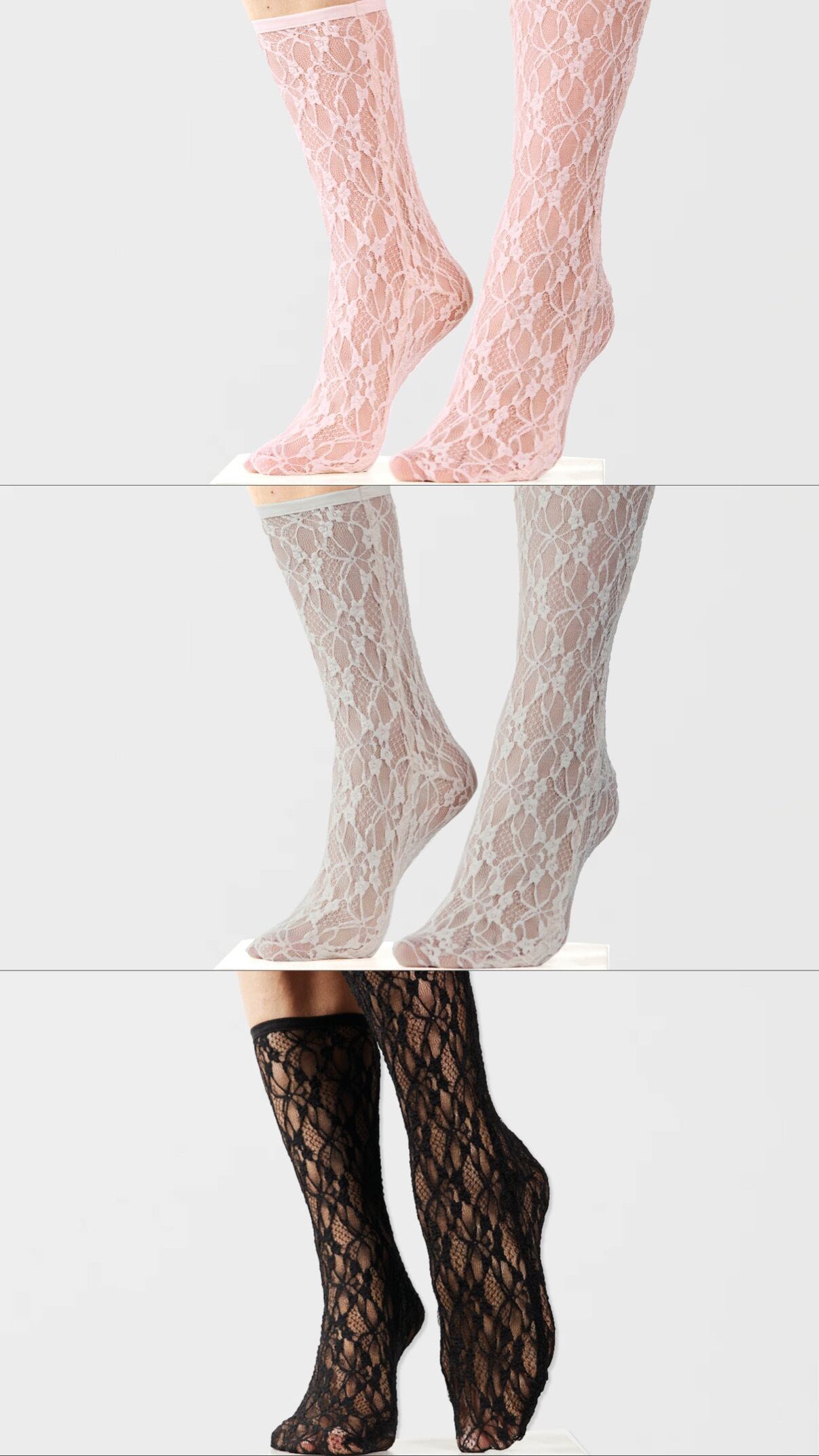 レースの靴下で、エレガントなデザインが特徴です。独特の素材感でどんなルックにもポイントになるアイテムです。
