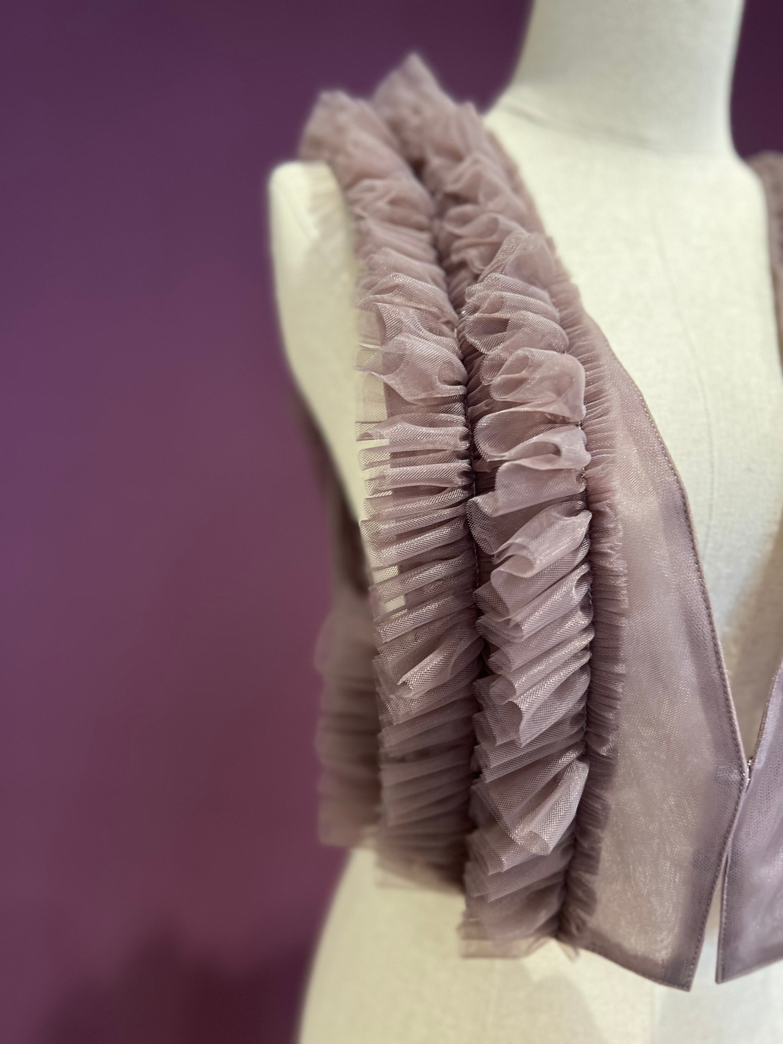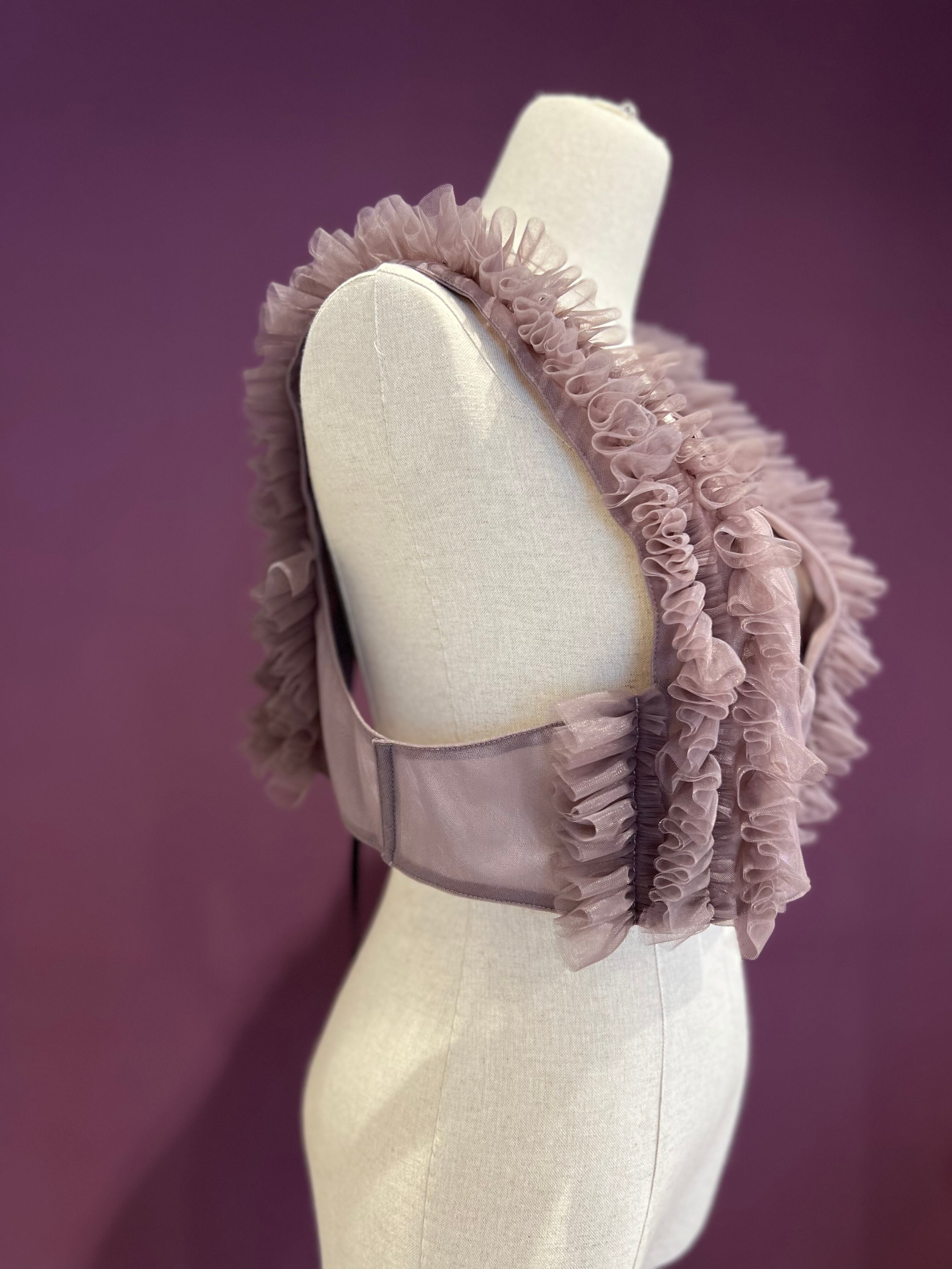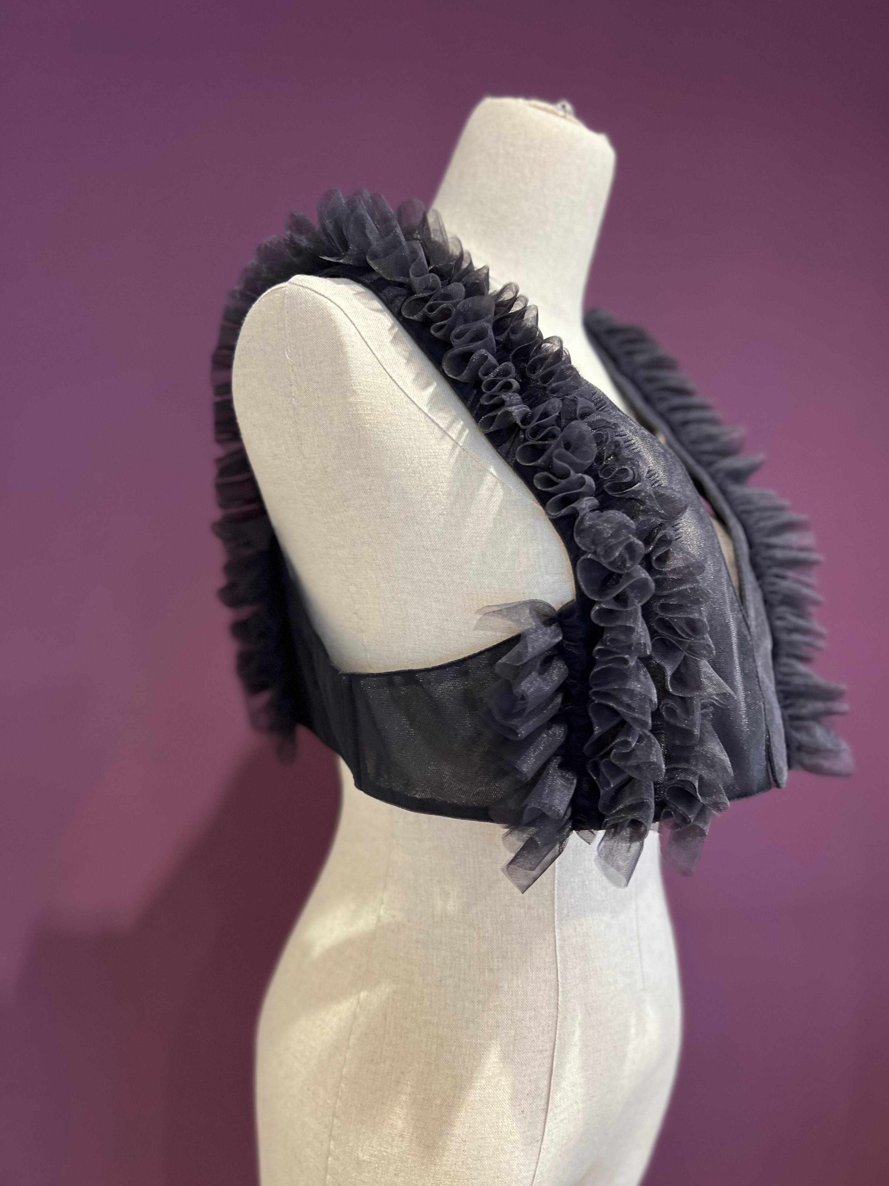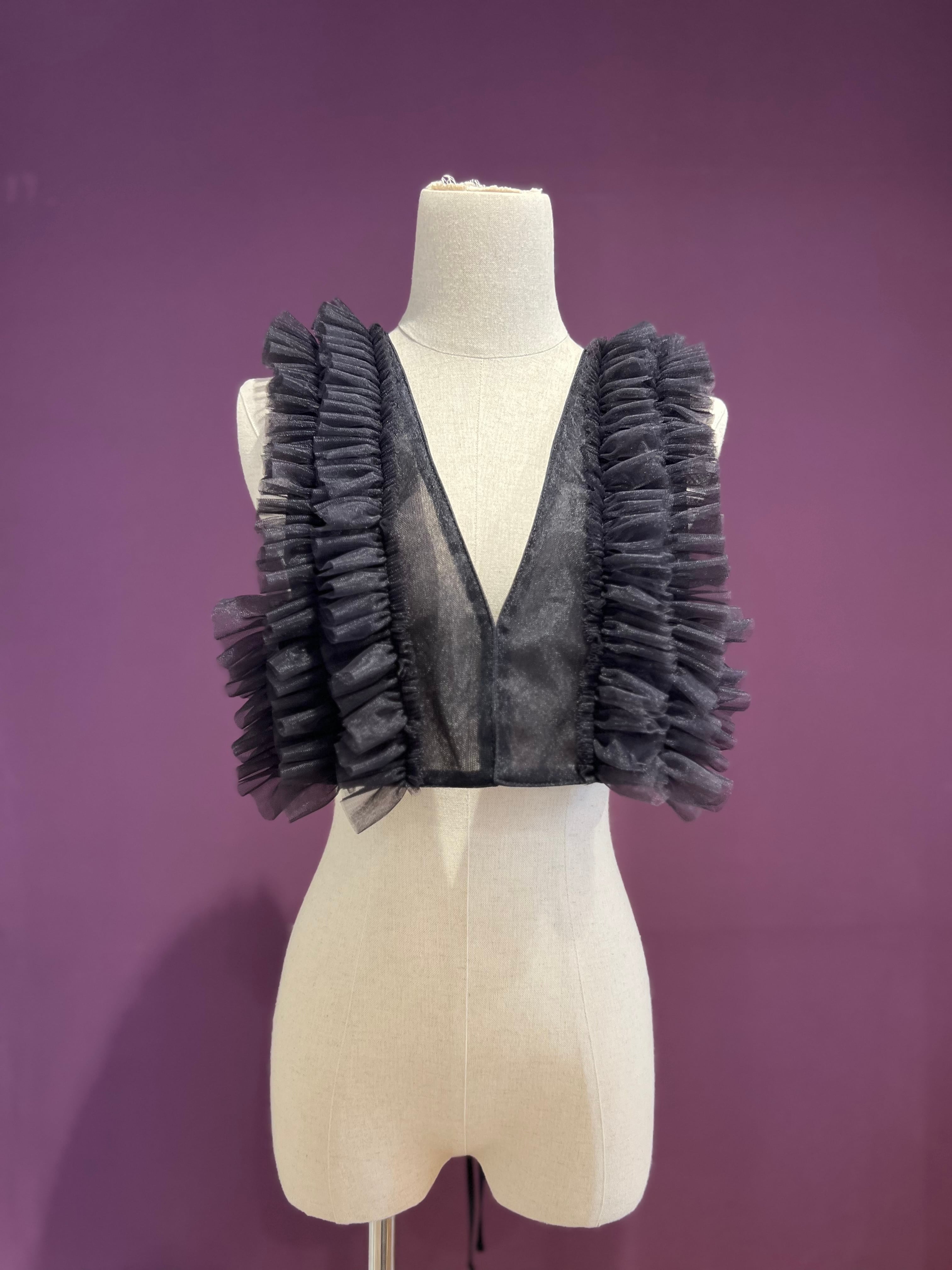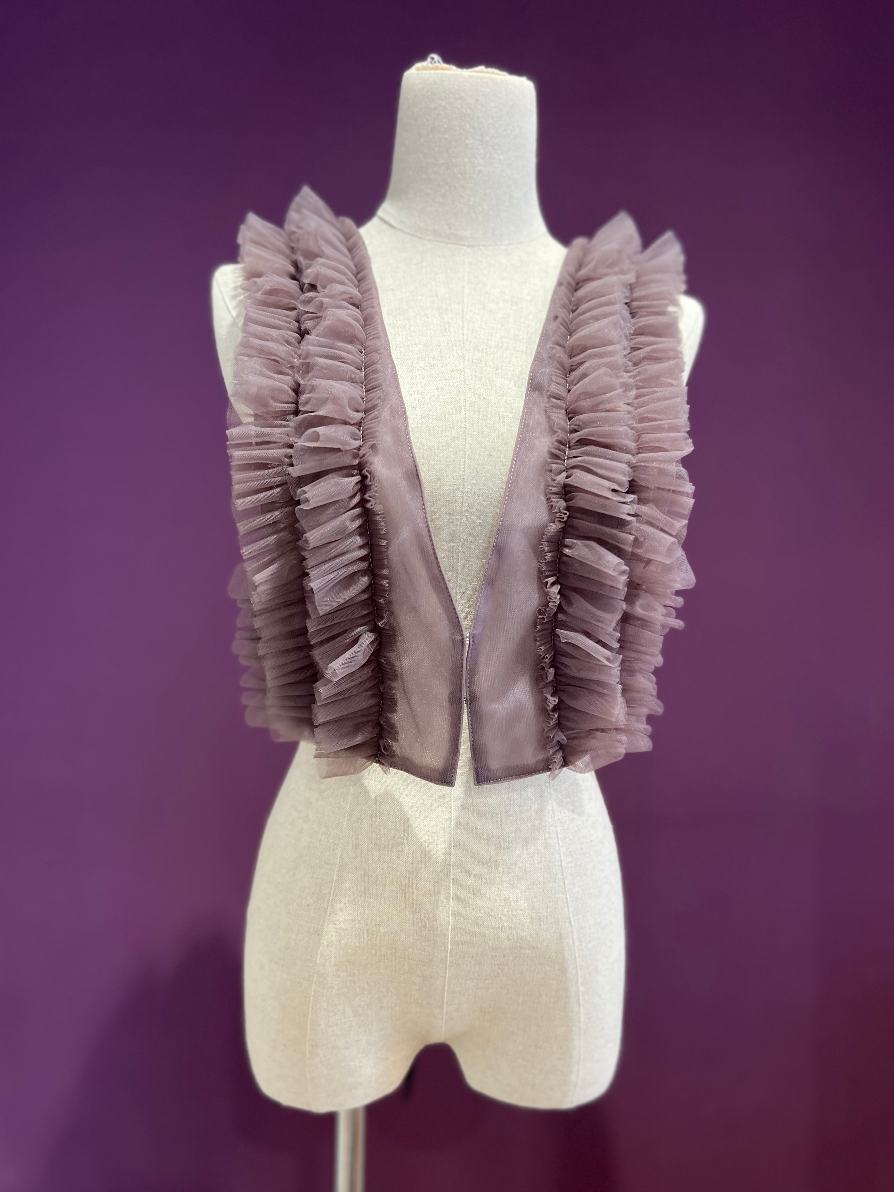 メンズのタキシードに見られる、ブザムシャツをモチーフにしたチュールベスト。 胸ヒダフリルをチュールで表現されています。